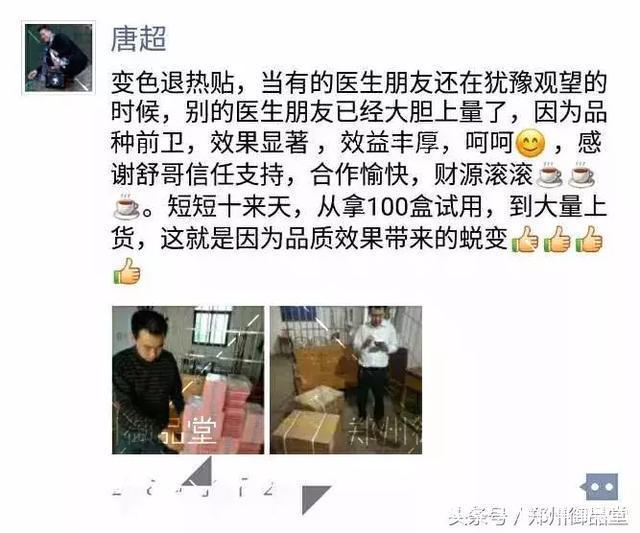 代理商往所在市场的药房诊所几件、十几件、甚至几十件的上货,有的没隔几天就开始2次要货了,有的药房说自己药店之前有别的品牌变色退热贴,万万没想到御品堂变色退热贴才进了几天,就全部销售出去,很是惊讶!甚至有的药房自从销售了御品堂感温变色退热贴,之前的普通退热贴再也不进货了。当然了,能让客户取得如此骄人业绩的,不仅要靠好产品更要有好的销售模式。